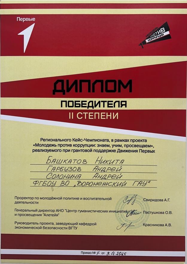 9 декабря 2025 г. студенты 3-го курса направления «Государственное и муниципальное управление» под руководством доцента кафедры управления и маркетинга в АПК Щёголевой Т.В. приняли участие в межвузовском кейс-чемпионате, посвященном вопросам противодействия коррупции, проходившем на базе Воронежского государственного технического университете в рамках проекта «Молодежь против коррупции: знаем, учим, просвещаем», реализуемого при поддержке «Движение Первых».